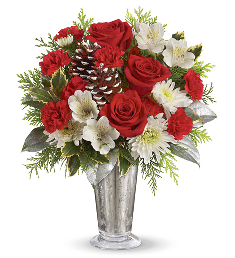 Make the holidays bright with this cheery Yuletide design featuring roses, alstroemeria, miniature carnations, pine, winter poms, and more, designed and delivered in a Mercury glass julep vase. Merry, bright, and great for any desk or table. Approximately 14 to 16 inches in height. Available for delivery in Chicago and suburbs from after Thanksgiving through December and early January. Style of vase may vary in some locales. (Photo copyright Teleflora.)